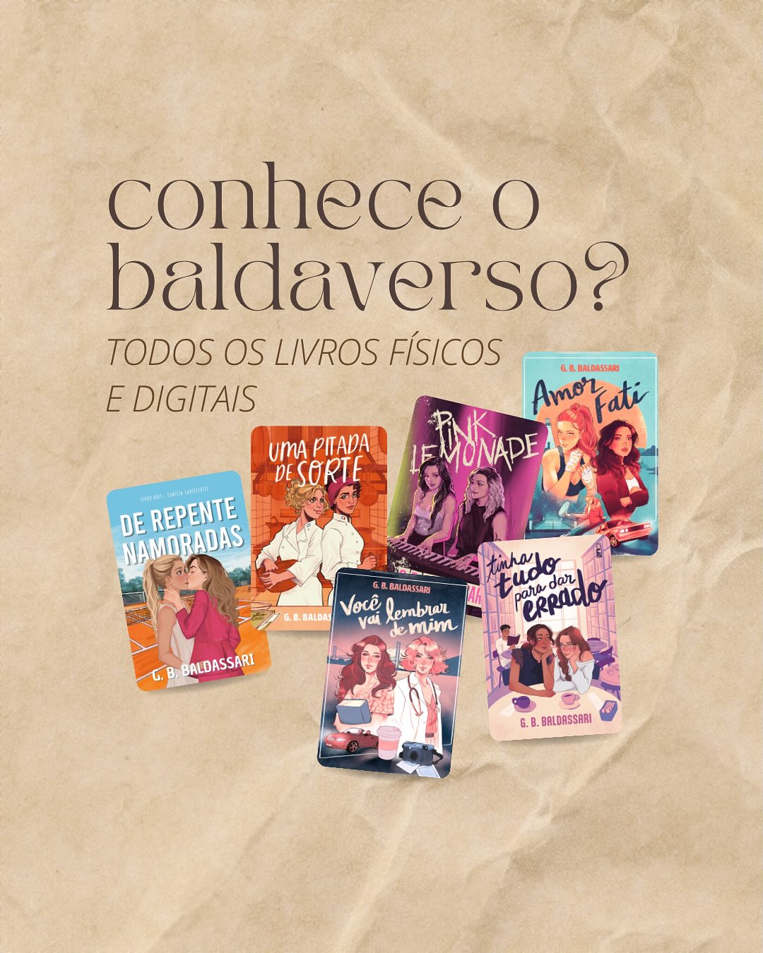 G. B. Baldassari é o pseudônimo de Gisele e Bruna, um casal que descobriu por acaso que poderia escrever junto. Moram em Santa Catarina e dedicam a maior parte do tempo a fazer o que mais amam: escrever comédias românticas em que a mocinha quase sempre é atrapalhada e invariavelmente termina com outra mocinha.